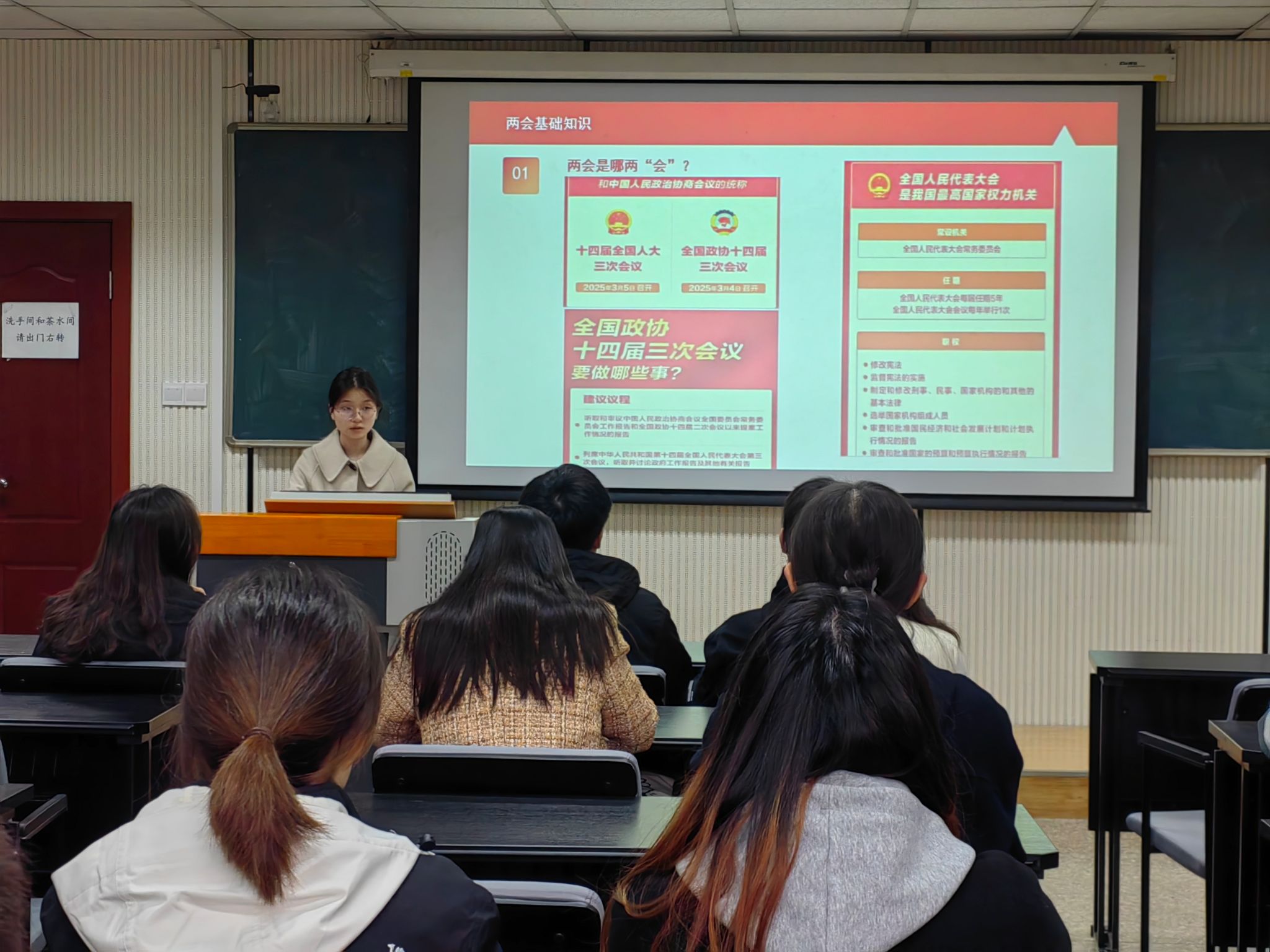 交流活动伊始,由四支部2022级组织委员刘星雨带领大家回顾今年共产党两会的基础知识和工作报告,并对两会的核心议题和政策方向进行解读。通过文字与视频多种方式为大家展开讲解。