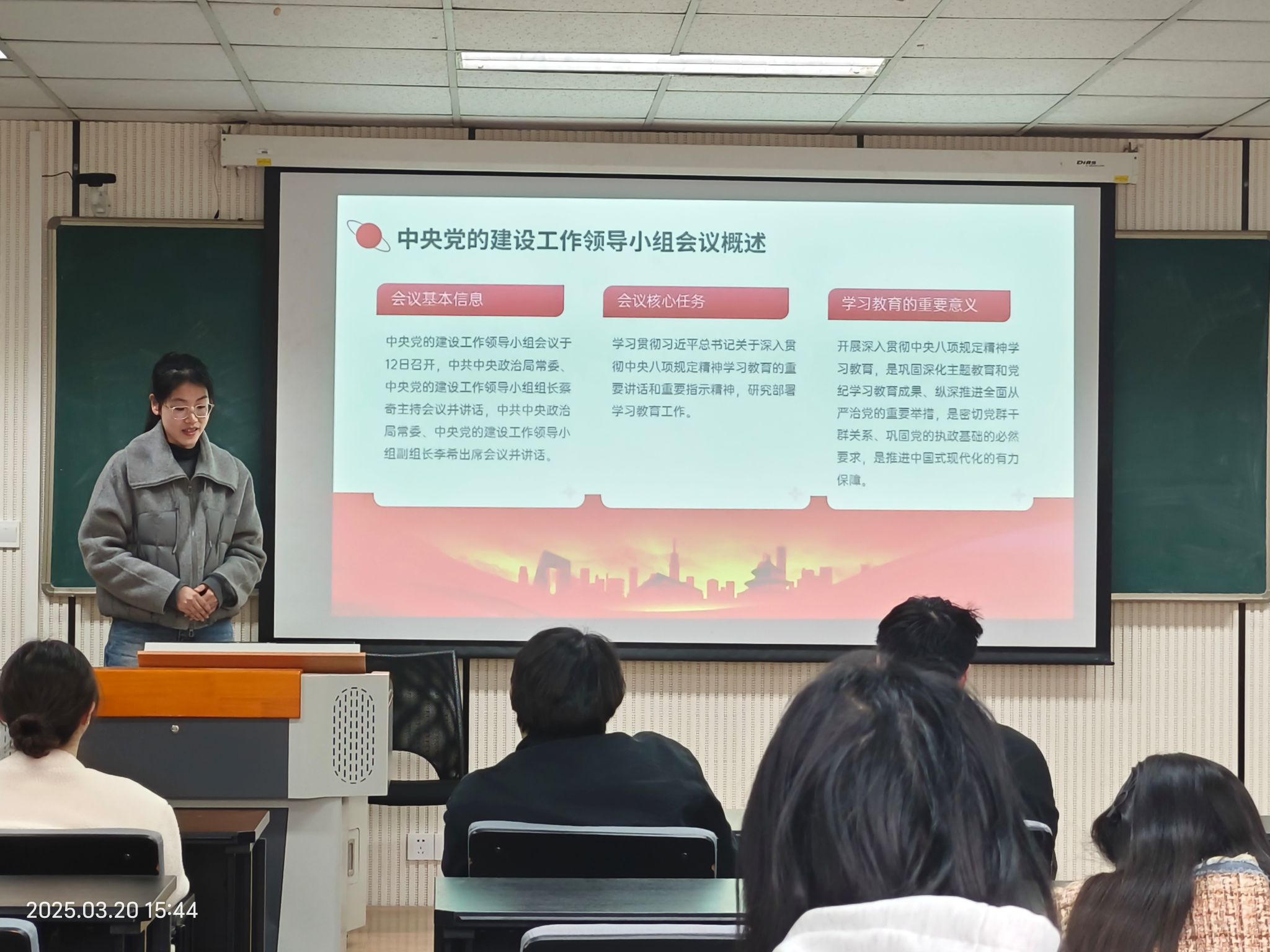 阙丽青同志以三维视角架构学习框架:首先梳理解读中央党的建设工作领导小组会议的核心要义,强调"学查改"闭环机制中质量、力度、成效的辩证统一;继而结合教育部党组会议视频资料,阐释教育系统深化作风建设的实践路径;最后聚焦中央八项规定精神内核,通过典型案例剖析与政策文本对照,系统阐述改进调研、精简会议、厉行节约等八项规定的治理逻辑,揭示"小切口推动大变局"的制度智慧。