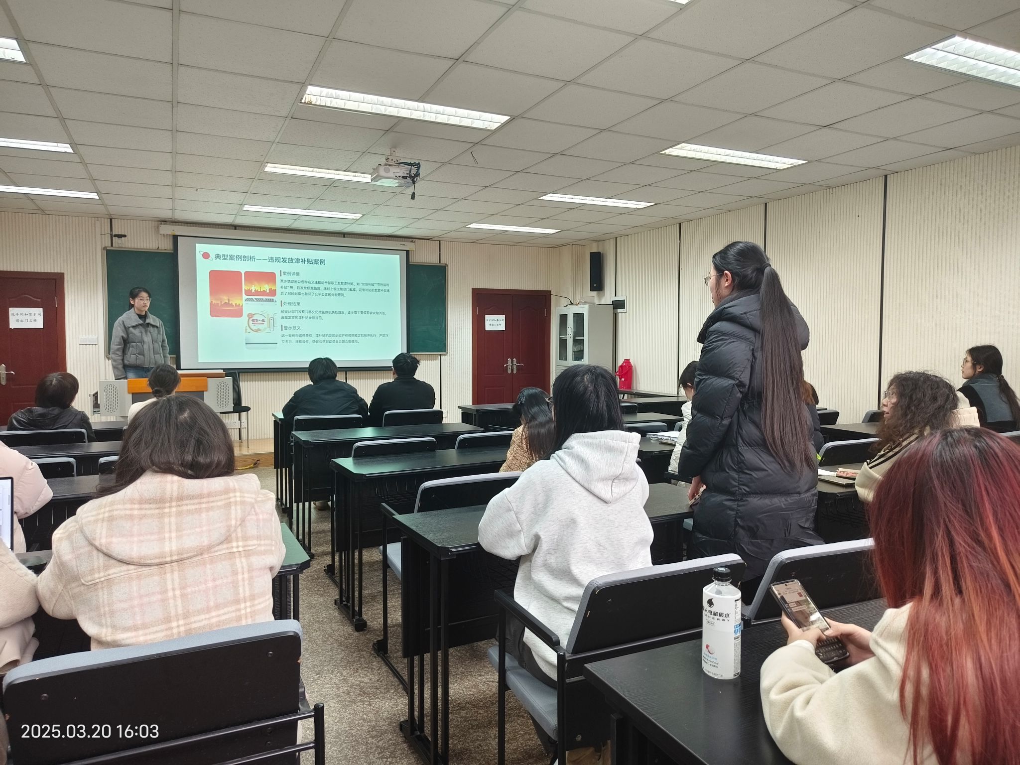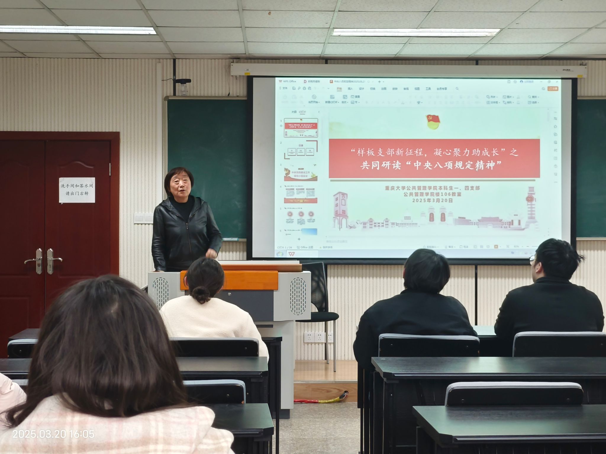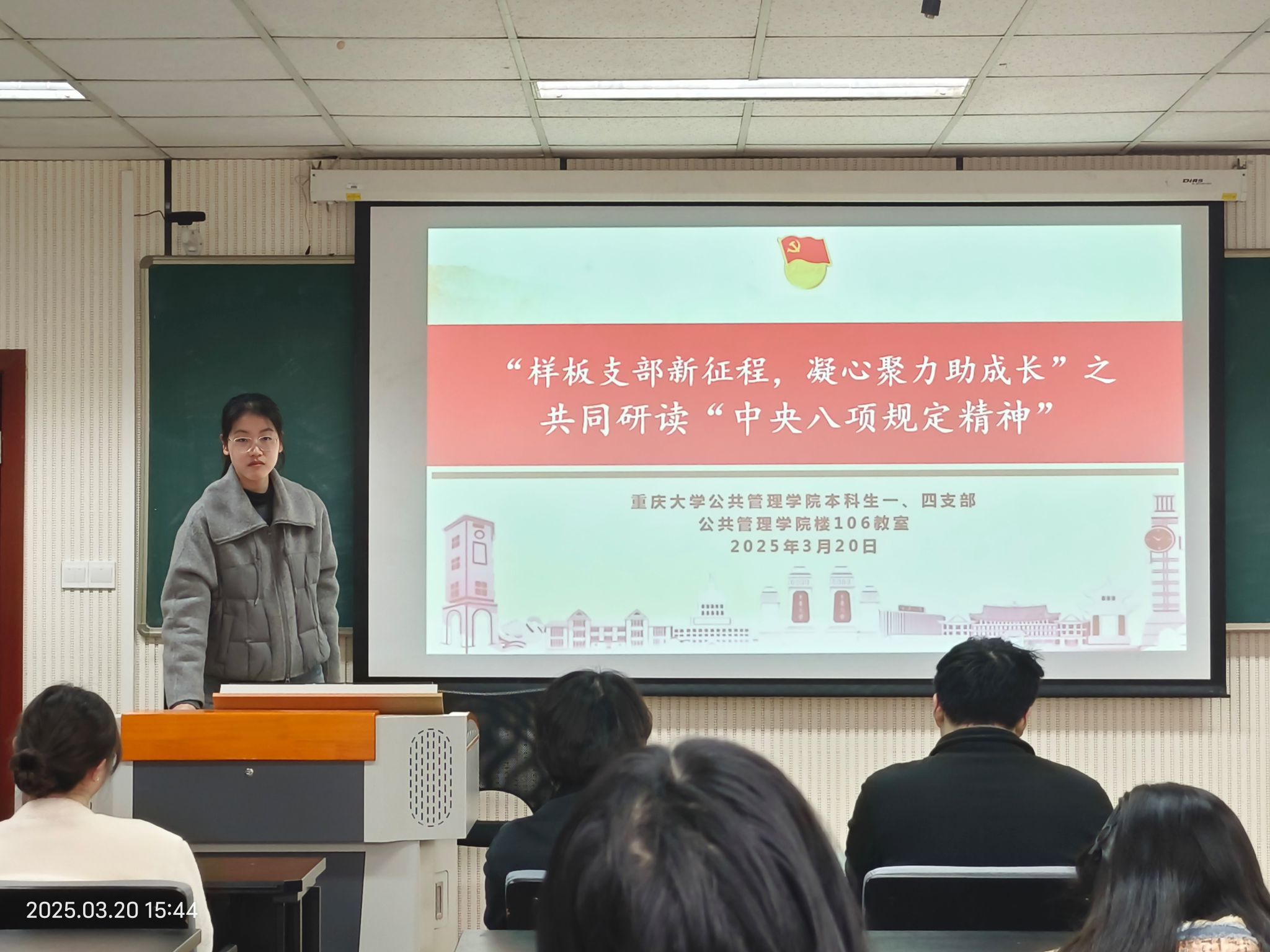 本科生一、四支部在学院楼106教室联合开展"样板支部新征程,凝心聚力助成长"之共同研读“中央八项规定精神”活动。在一支部书记王丽娟统筹组织下,第五党小组成员阙丽青主持活动,一、四两支部全体党员通过理论研读与思想碰撞,共同探寻作风建设的精神坐标。