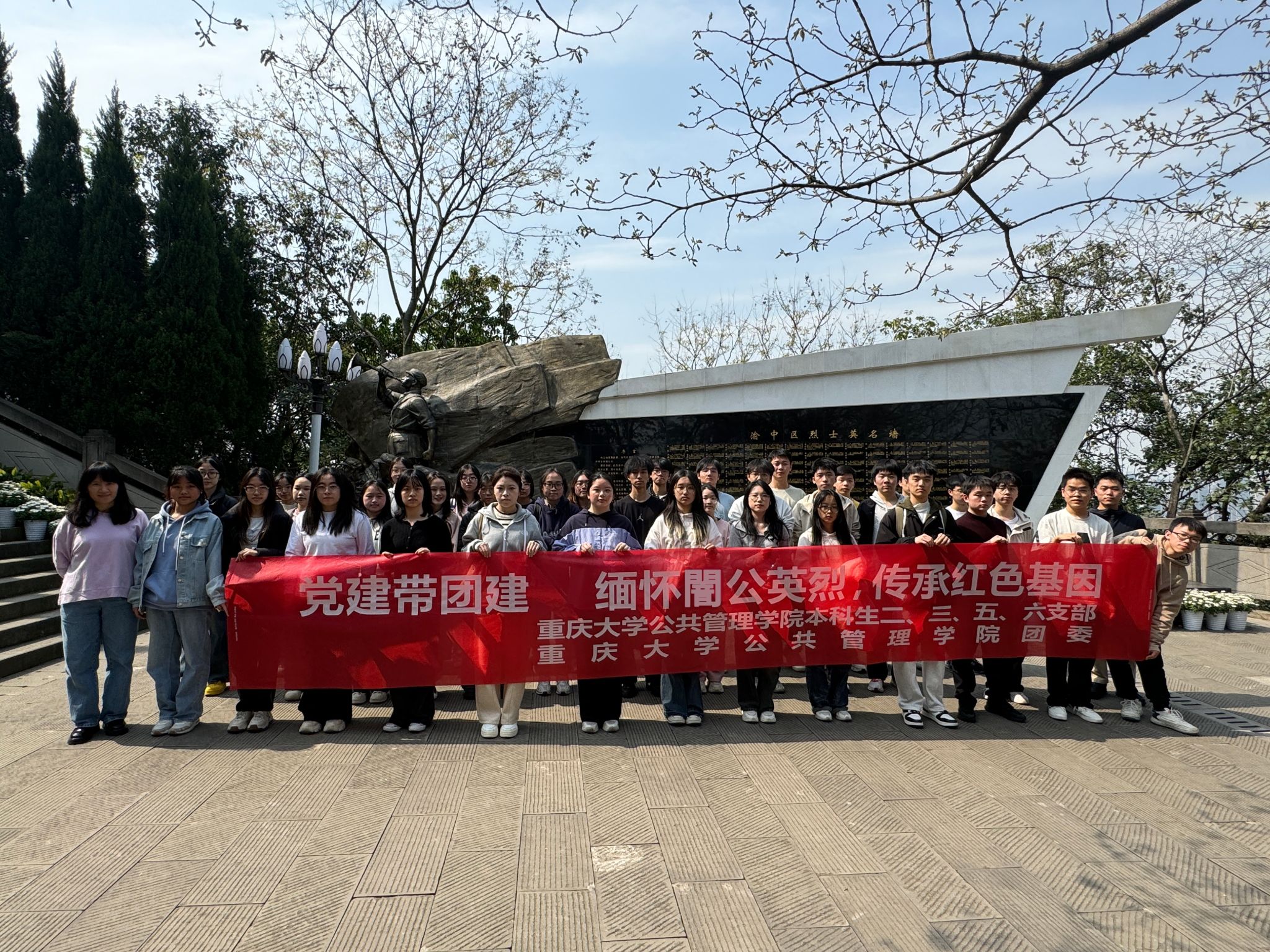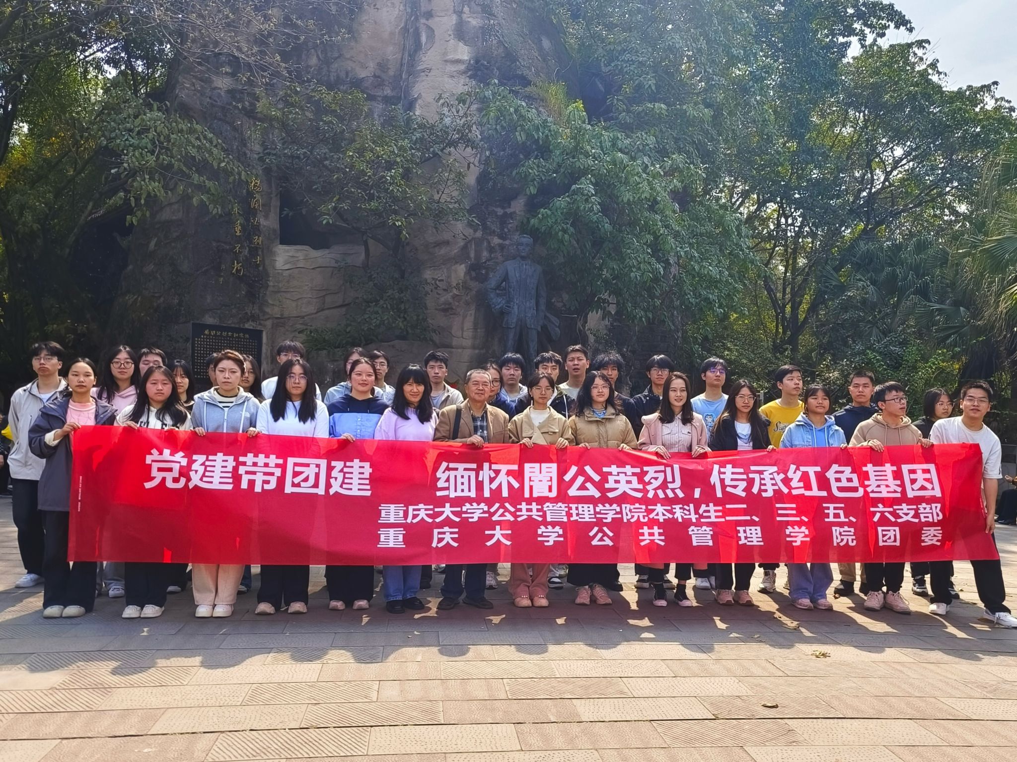 二、三、五、六支部联合学院团委举办了“党建带团建 缅怀闇公英烈 传承红色基因”主题教育活动,四个支部的学生党员、发展对象、入党积极分子以及本科2023级各团支部团员青年代表一行前往重庆市佛图关公园杨闇公烈士铜像前通过敬献鲜花、集体宣誓等形式开展吊唁和学习教育活动,缅怀革命先烈,传承红色基因。