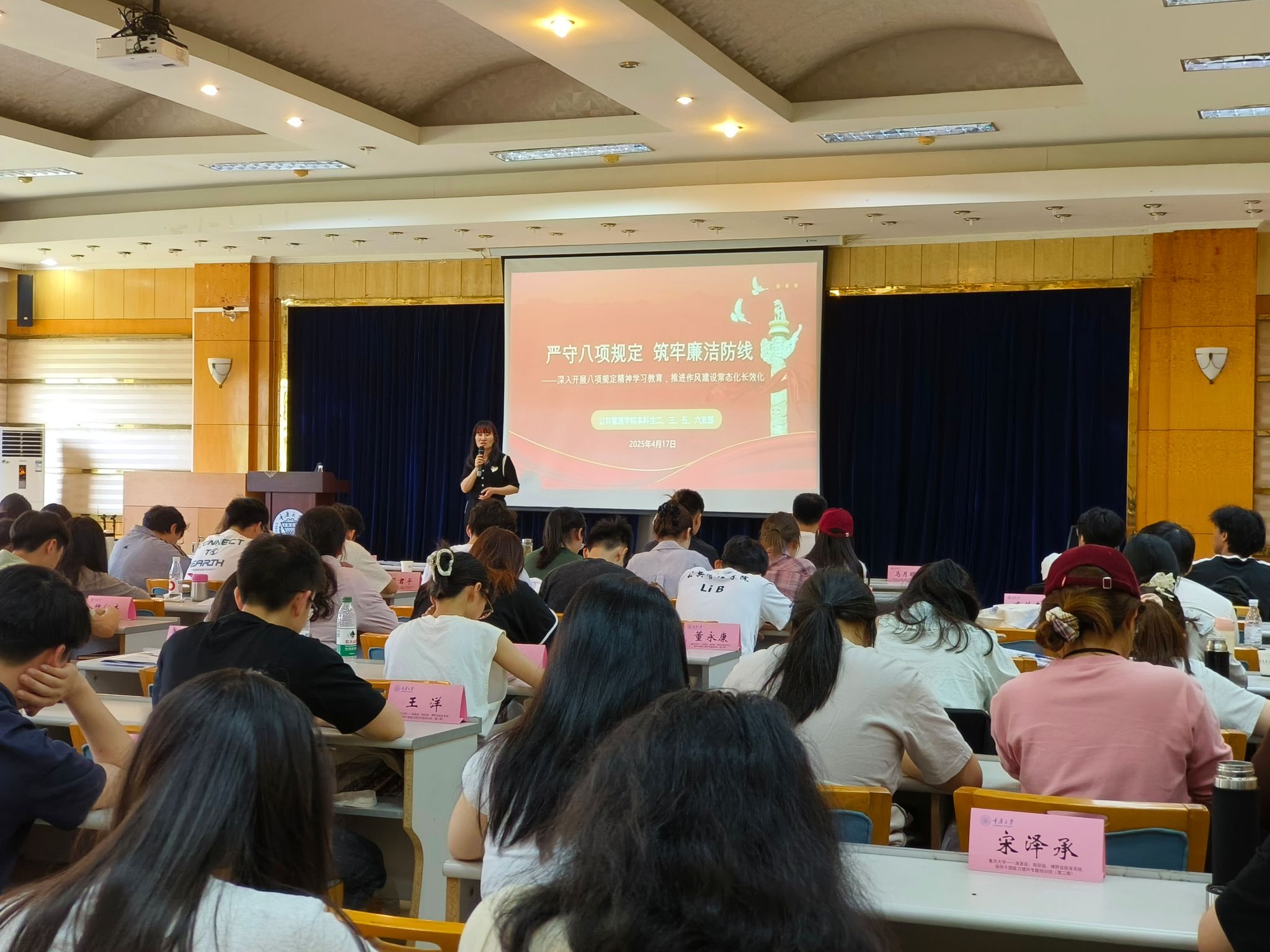 本科生二、三、五、六支部在学院202会议室联合开展了“严守八项规定,筑牢廉洁防线”专题学习。本次会议围绕中央八项规定精神和习近平总书记关于加强党的作风建设的重要论述展开学习与讨论,旨在引导四个支部全体党员和入党积极分子增强党性修养,加强纪律意识和廉洁意识,树立优良作风,更好地践行党的宗旨,推动全面从严治党。
