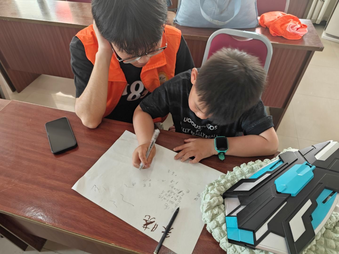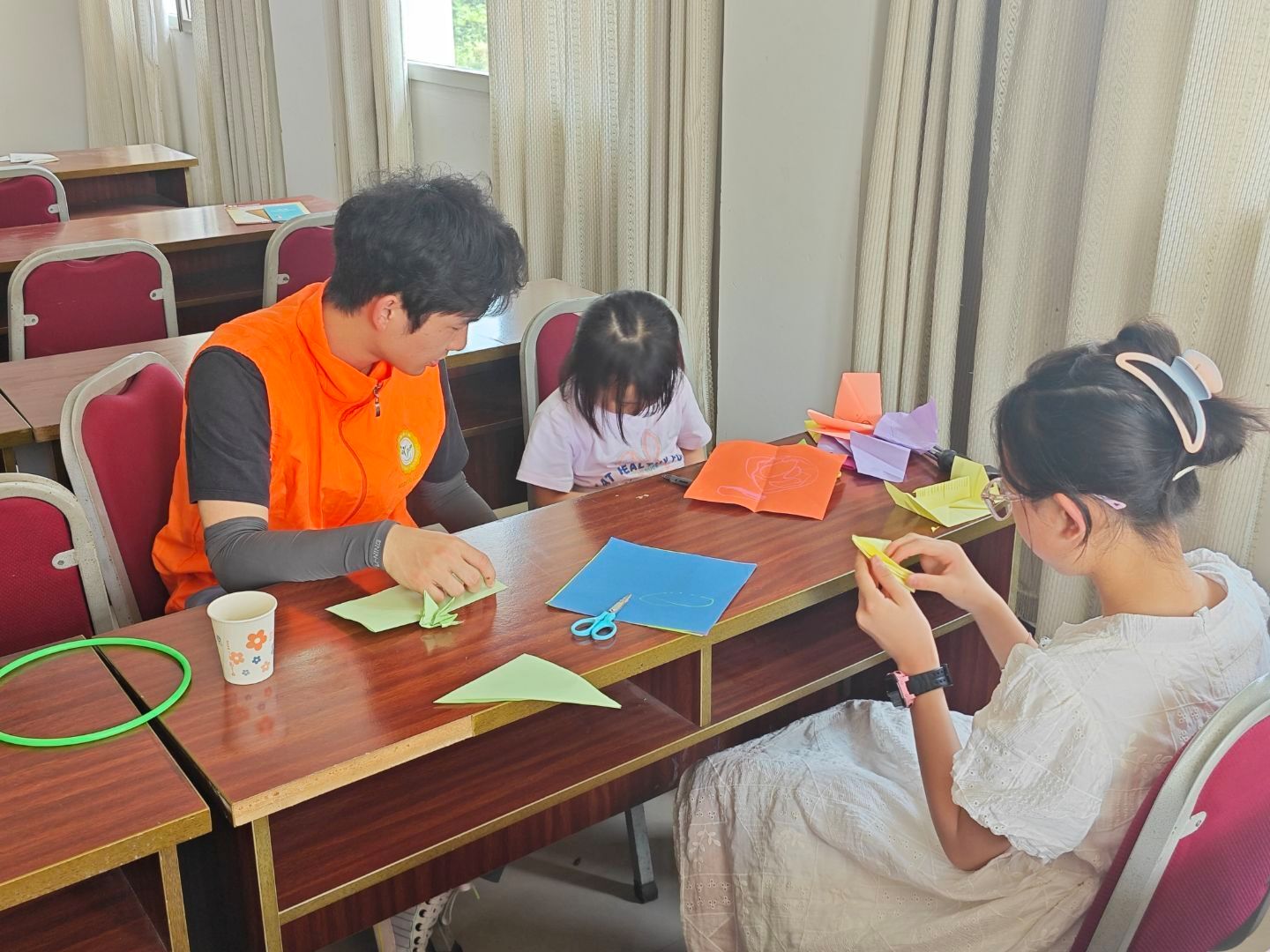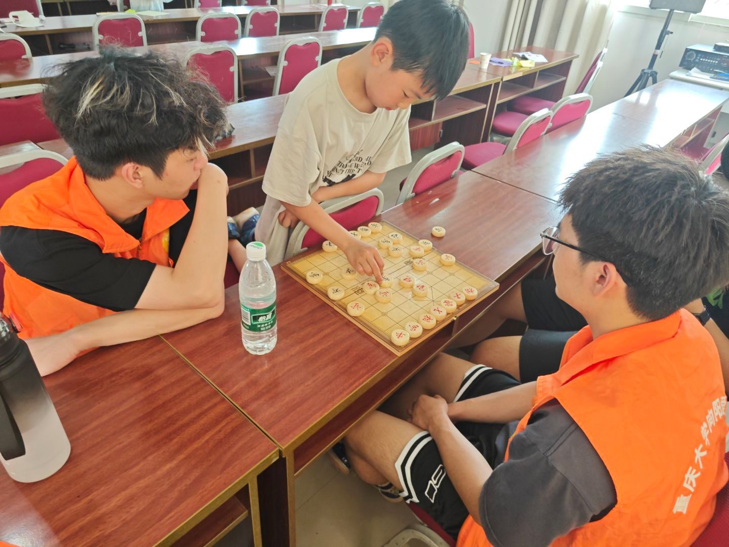 活动当日,尽管烈日当空,十名志愿者依然热情饱满地奔赴白林村村委会。活动现场,棋类竞技区的象棋与五子棋对弈激发思维火花,乒乓球台旁的你来我往洋溢着青春活力,手工创作区的剪纸折纸作品栩栩如生。志愿者们还参与了课业辅导环节,耐心解答孩子们的学习困惑。一位小朋友在纸上默写出一篇《春晓》,志愿者们都为他鼓掌。