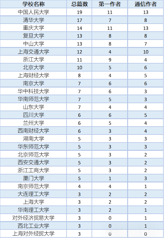 刘炳胜教授与张金凤副教授各以7篇的发表量,在全国学者中并列榜首,袁萌副教授与冉戎教授也凭借其高水平学术成果上榜,重庆大学以总计14篇的发表量,在全国高校中仅次于中国人民大学和清华大学,位列第三位,实现了历史性的突破。